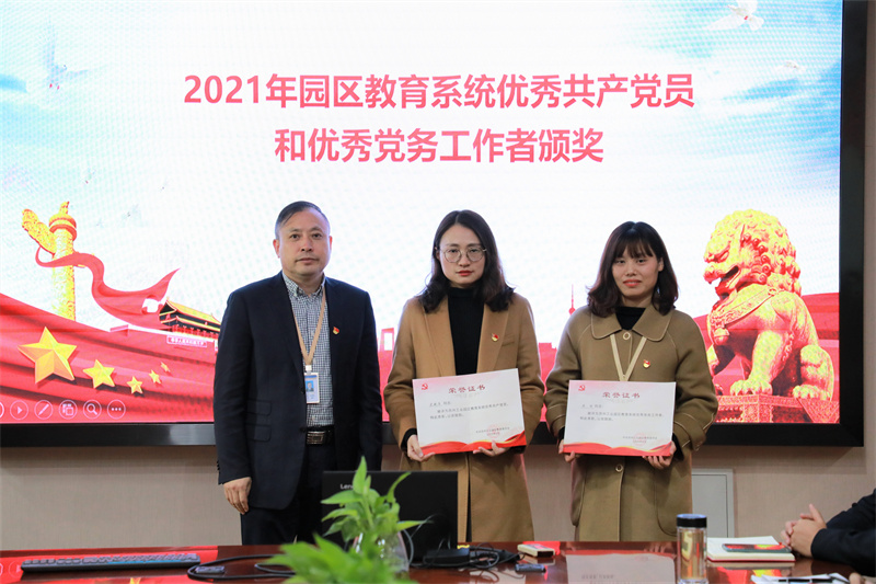 会上,曹成同志为2021年园区优秀共产党员沈晓萍同志和优秀党务工作者周丽同志颁发了荣誉证书。沈晓萍同志进行了发言,她感谢学校党总支在她工作中给予的无微不至的照顾与指导,感谢党总支赠与她的“三件法宝”:赤诚之心、务实之手和睿智之言。