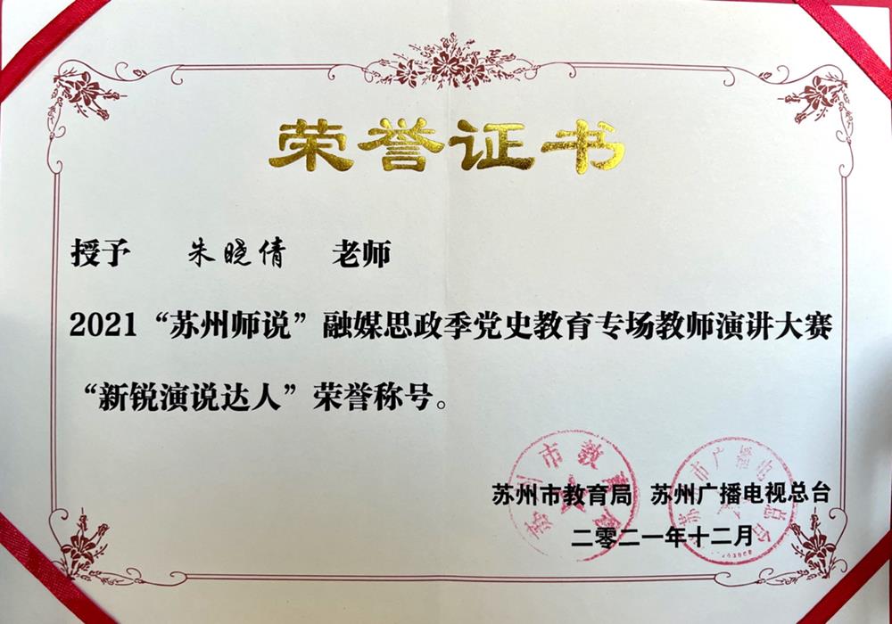 我校朱晓倩老师在2021“苏州师说”之融媒思政季党史教育专场教师演讲大赛荣获: