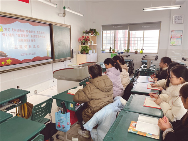 为深入贯彻落实江苏省第十四次党代会精神,党员们首先在线学习了吴政隆作的题为《争当表率 争做示范 走在前列 奋力谱写“强富美高”新江苏现代化建设新篇章》的报告。报告指出,过去的五年是砥砺奋进取得历史性成就的五年,新时期还要坚决扛起新征程新的光荣使命,奋力开创江苏现代化建设新局面,持续推进新时代党的建设新的伟大工程。报告精神振聋发聩,全体党员教师受益匪浅。