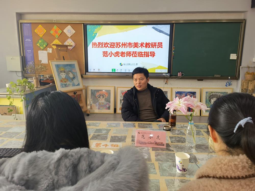 1月18日下午,苏州市美术教研员范小虎老师应邀来到方洲小学,对学校美术建设工作进行现场指导和培训讲座,全体美术老师陪同参观并聆听指导。范老师依次参观了方悦楼美术展厅和各大工作室,对方洲小学美育赞誉有加,同时也对学校美术建设和教师个人成长都提出了许多建设性意见。