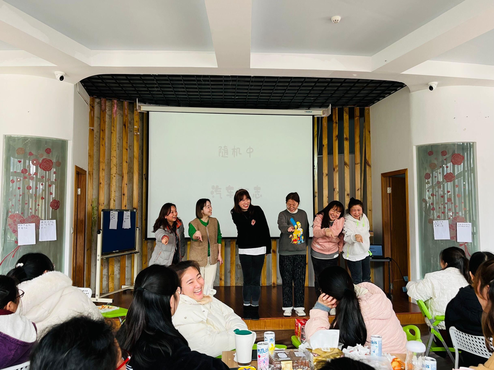一首首热闹快乐的歌曲唱出新年的祝福,一支支欢快灵动的舞蹈舞出美好的生活;游戏“新年祝福词语接龙”既有比赛的乐趣,也有老师相互之间美好的祝愿。