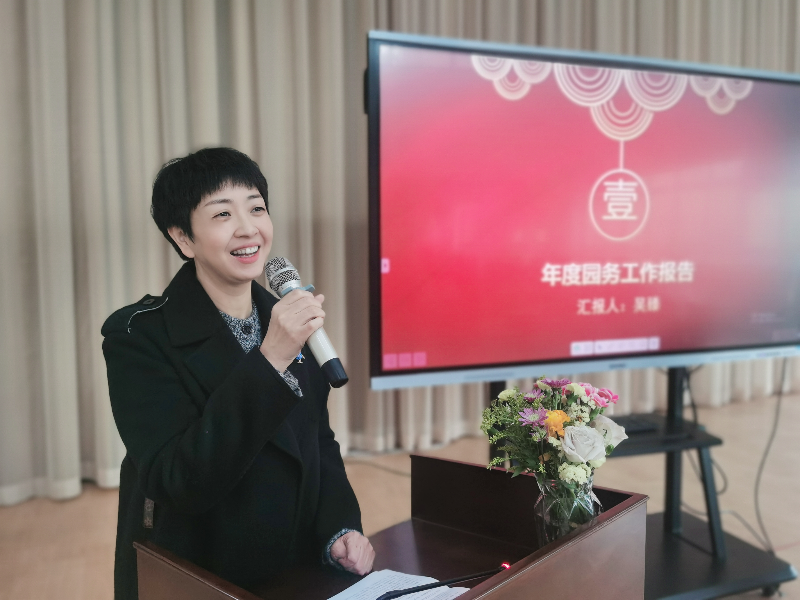 首先,园长吴臻向全体教师作2021年度工作报告、江景雅老师代财务负责人潘裕苗作年度财务情况报告、工会主席林彦作年度工会工作报告,并集体通过。