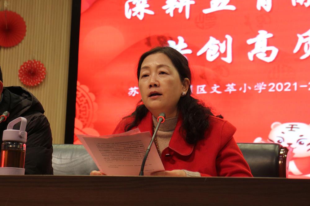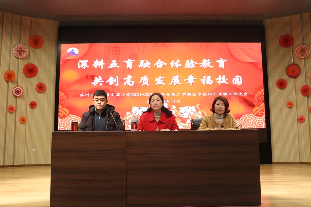 金虎生威岁自新,开元淑气转洪钧。2月11日,苏州工业园区文萃小学召开2021-2022学年度第二学期全体教职工开学工作大会。大会分为两个议程:校长室高位部署新学期工作、各部门主任就十四五部门工程项目及新学期工作要点作交流。本次大会由党政办主任蒯江萍主持,全体教职工参会。