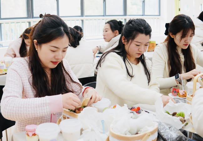 领学教师李祉凌手持多肉植物,介绍其种类和习性,分享养护小窍门。老师们围坐一起,挑选心仪的多肉植株,将它们精心栽种进竹编花篮,搭配上彩色石子、小摆件。大家相互交流,讨论着色彩搭配与造型设计,不一会儿,一个个生机盎然的花篮多肉作品诞生。翠绿饱满的多肉与精致花篮相得益彰,寓意着蓬勃的生命力,这不仅是一份手工作品,更是对女性教师们如春日繁花般灿烂芳华的礼赞。