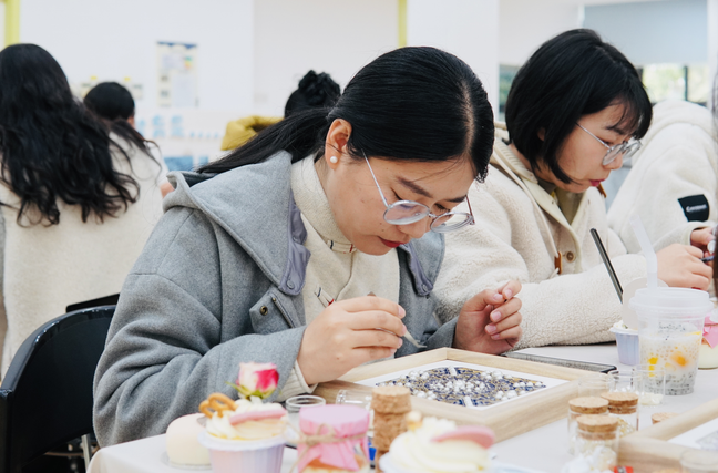 宋锦珍珠画制作区,领学教师马艺鸣展示着华丽精美的宋锦,讲解其独特纹理与历史文化价值,随后演示如何用珍珠、彩钻等材料在宋锦底料上创作绘画。老师们依照指导,用胶水仔细粘贴珍珠,排列组合成花卉、山水等图案,每一颗珍珠的镶嵌都饱含着对传统文化的敬畏与热爱。一幅幅宋锦珍珠画逐渐呈现,细腻的珍珠与古朴的宋锦碰撞出艺术火花,描绘出江南水乡的温婉柔情,寄托着教师们对美好生活的向往,以及对教育事业的深厚情感。
