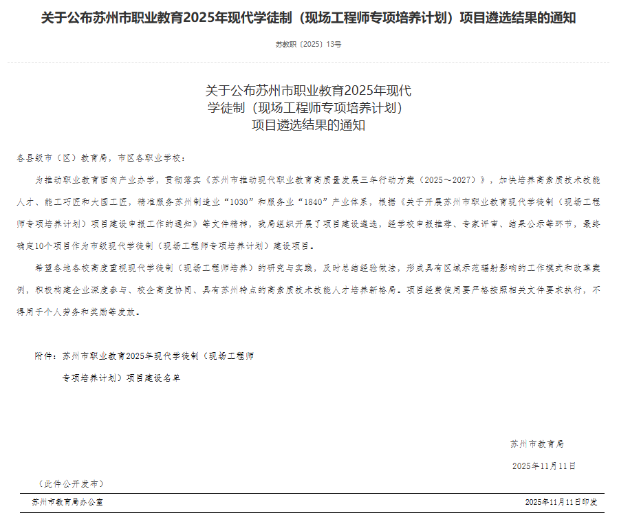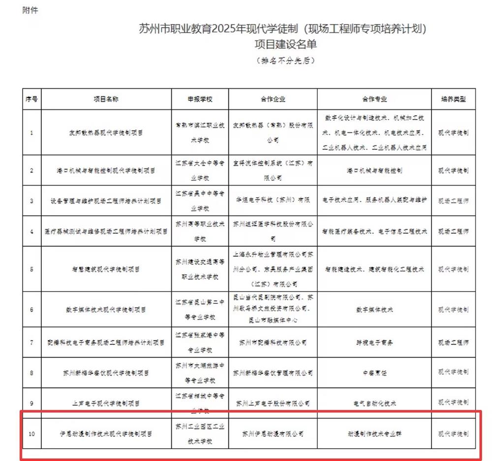 喜报:我校“伊恩动漫制作技术现代学徒制项目”获评苏州市职业教育2025年现代学徒制建设项目