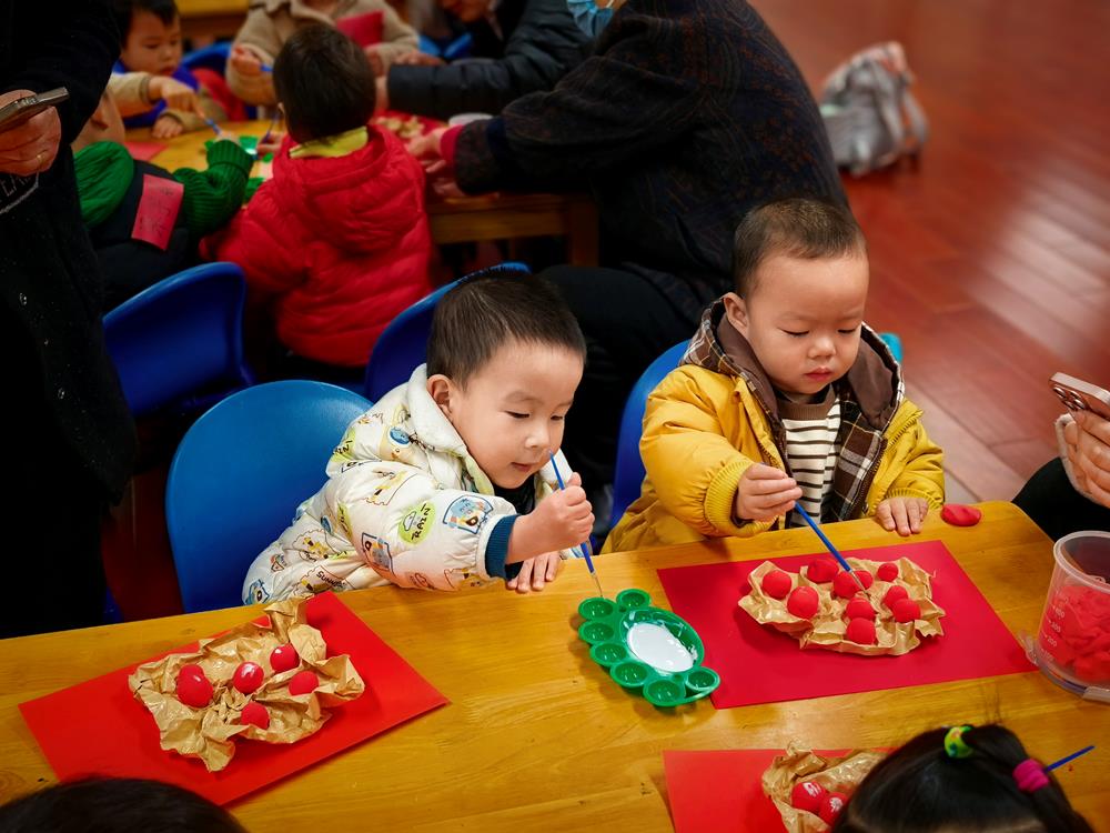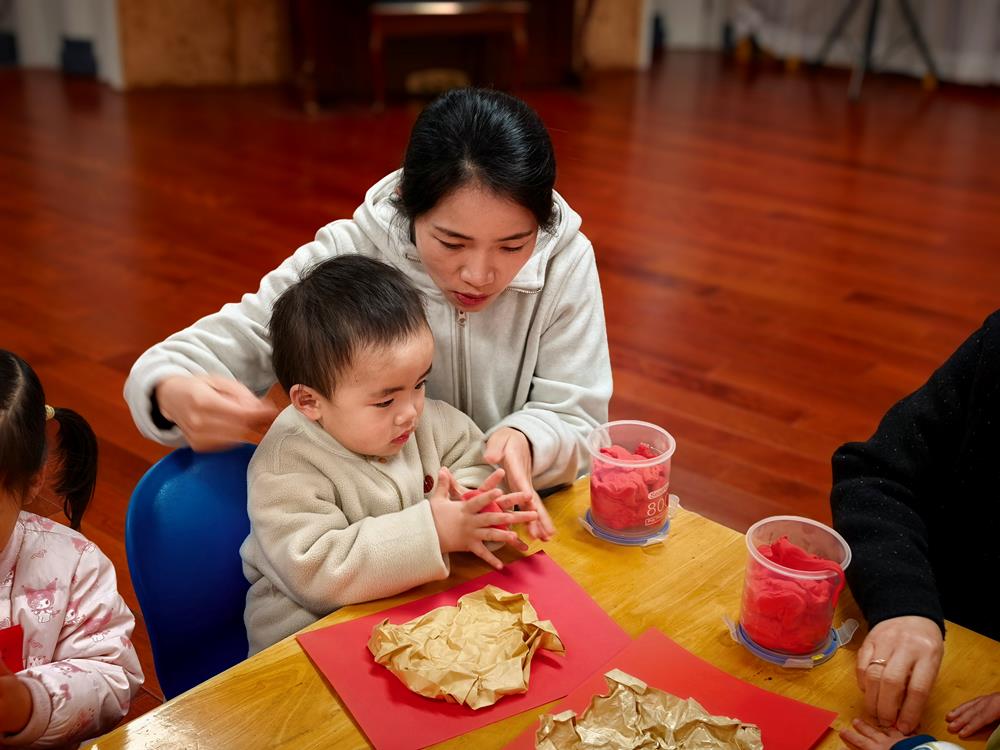 手工“糖霜山楂球”来啦!宝贝们用红色黏土搓圆球,再用白色颜料打造甜甜的糖霜,亲手制作充满年味的小作品,收获满满的成就感。