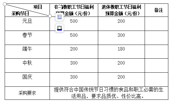2.采购预算经费:在编教职工48人,节日福利1800元/人;退休教职工2人,节日福利1080/人。